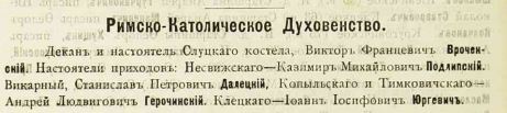 «Материальная поддержка правительства тех настоятелей приходов, в которых богослужение велось на русском языке, была ощутимой. Например, в 1891 г. в Минской губернии на эти цели было потрачено больше 60 тыс. руб. Дополнительное жалованье получили декан Минска и настоятель Св. Троицкого костела прелат Макаревич; Бобруйский декан и настоятель Бобруйского костела Олехнович; Борисовский декан Лукашевич; Слуцкий декан Урачинский; Игуменский декан Байчинский; настоятели костелов: Игуменского – Бертович, Узденского – Кушалевский, Копыльского – Герачинский, Клецкого – Юргевич; капеллан Минского благотворительного общества каноник Гавронский и 14 органистов.»